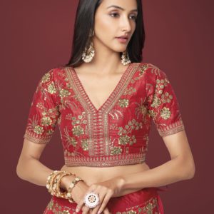 Give a dazzling update to your festive wardrobe by adorning this attractive red color lehenga made of slub silk material decorated with dori work, zari sequin work, and embroidery work.