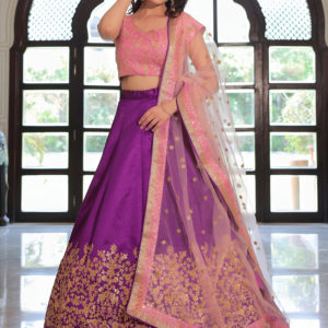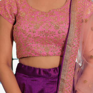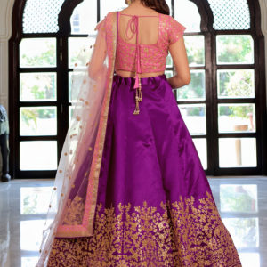 Lehenga: The lehenga is crafted in a rich purple silk fabric adorned with detailed gold zari sequind and dori floral embroidery along the hemline. The shimmer of the zari work adds a royal touch, making it ideal for weddings and festive celebrations.