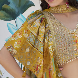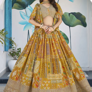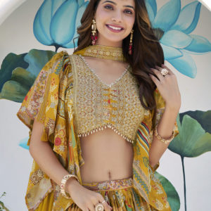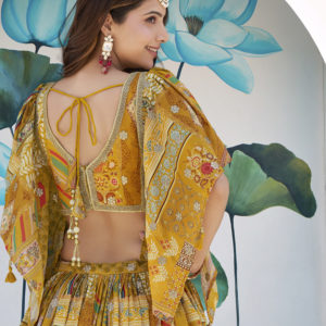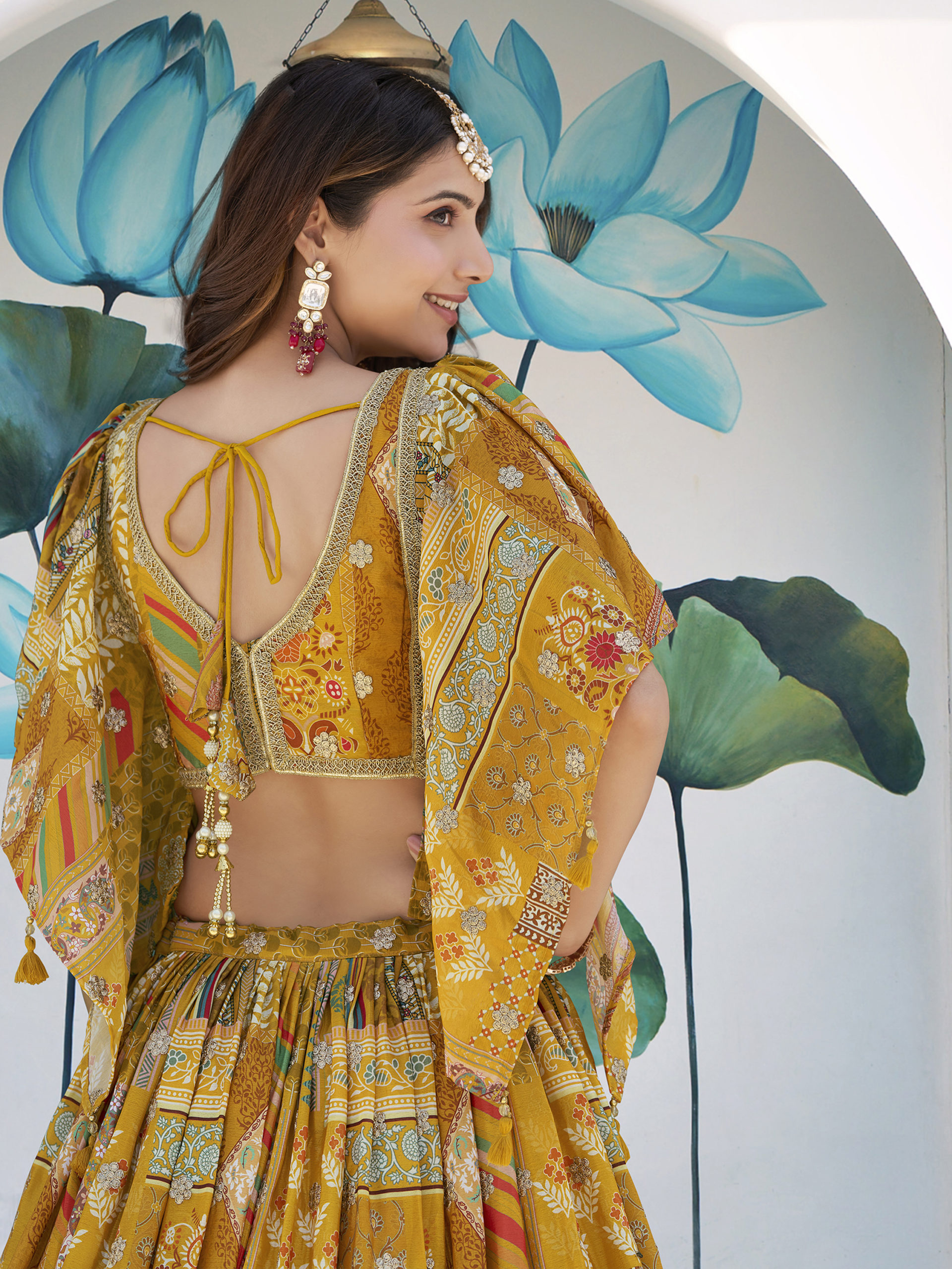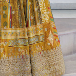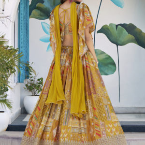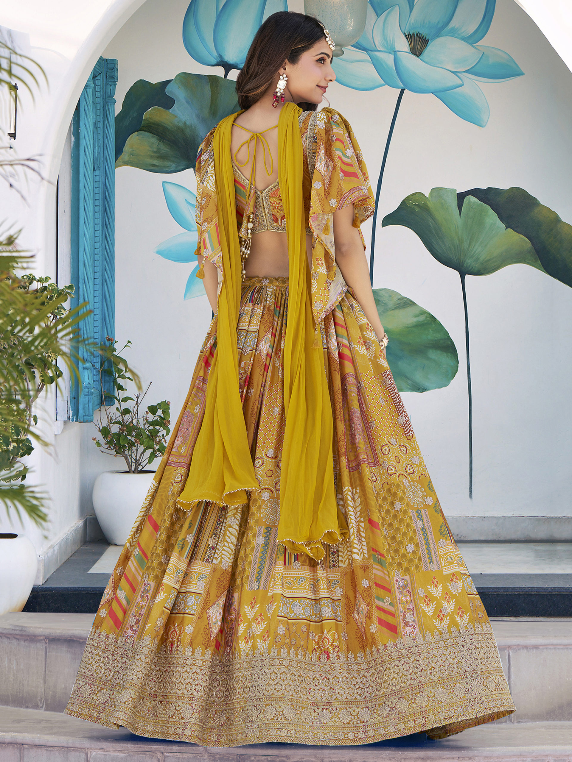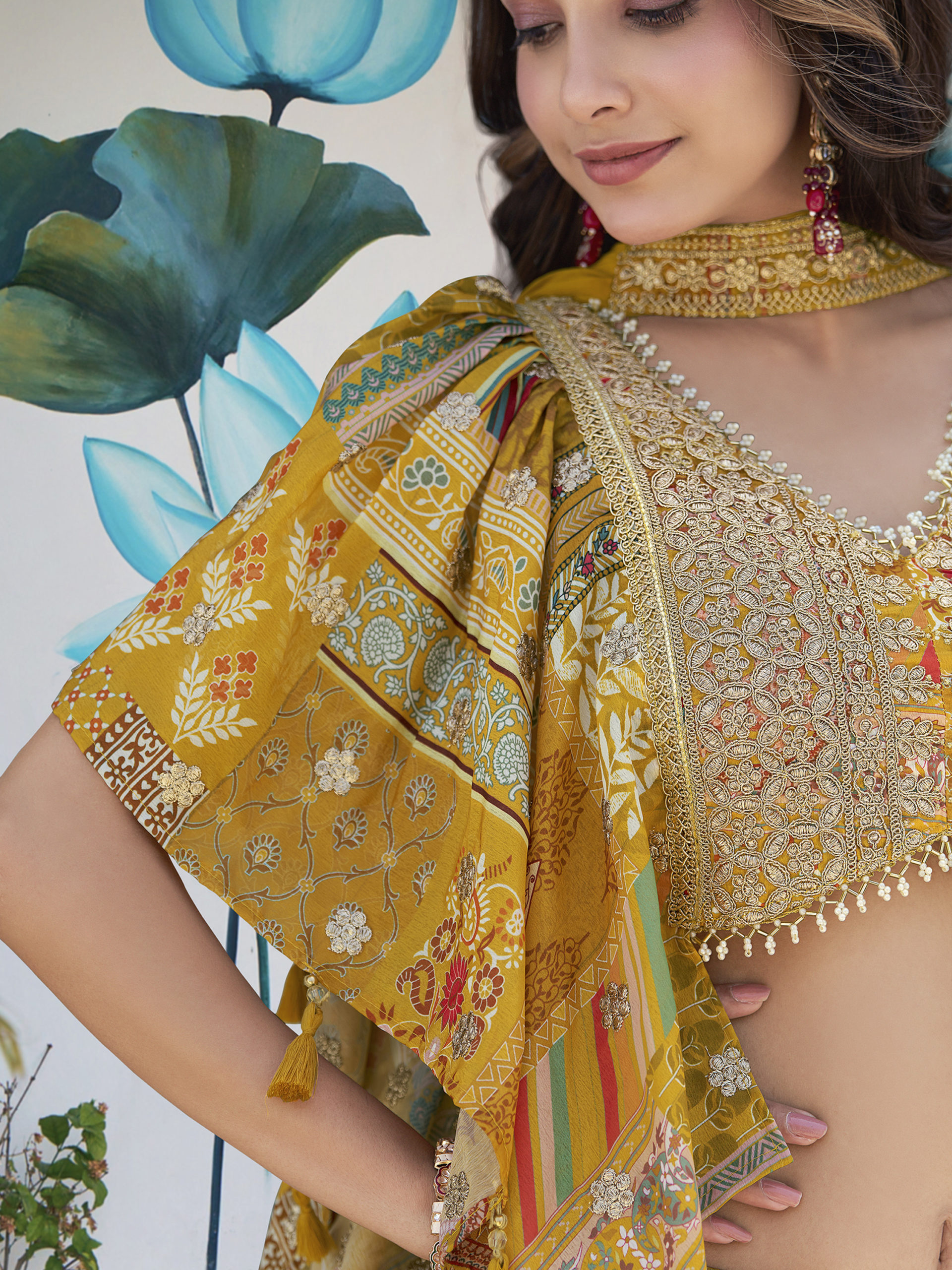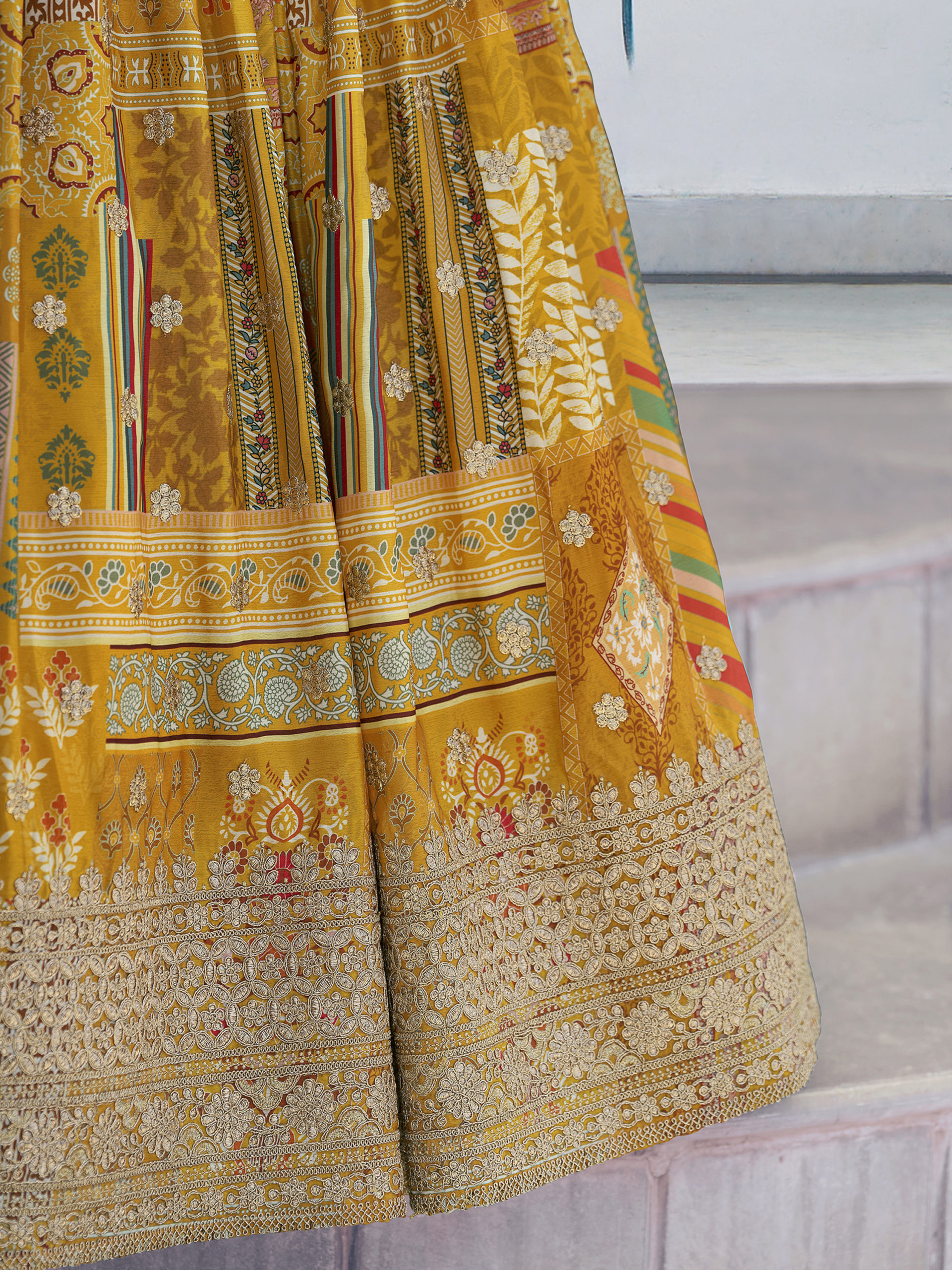 Crafted in vibrant mustard yellow, this flared chinnon silk lehenga features rich multicolor digital prints in traditional patterns. The design is further enhanced with a grand golden zari and dori embroidered border that adds elegance and grace to the silhouette.